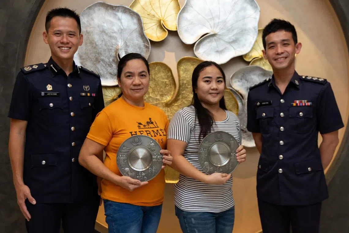 (From left) Commander of Bedok Police Division Justin Wong, Ms Chita Guzman Abaya, Ms Abaya Rizzalyn Estrella and Superintendent of Police Edwin Yong.
