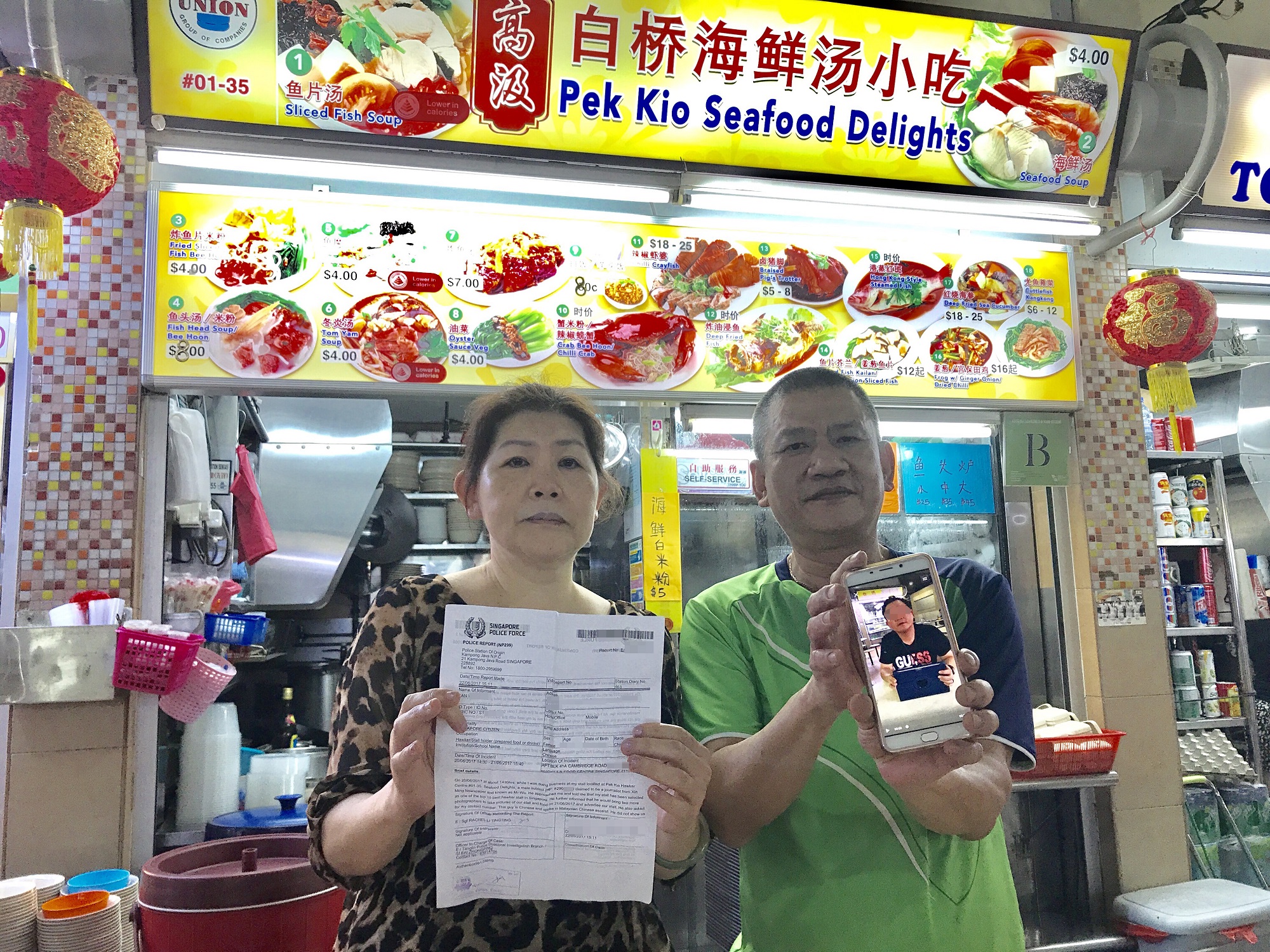 Mrs Chen and her husband hold up the police report and a photo of the man who had allegedly posed as a Shin Min food reporter and cheated her of $500.