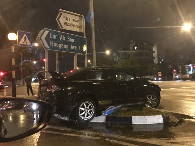 The accident left a black car stranded on a grass verge at the junction of Upper Paya Lebar Road and Lorong Ah Soo on Feb 28, 2018.