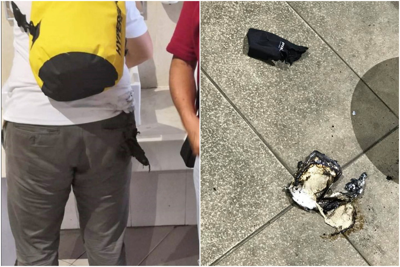 Photos show the badly burnt and melted remains of the power bank on the floor, as well as a large frayed hole in the man's back pocket.