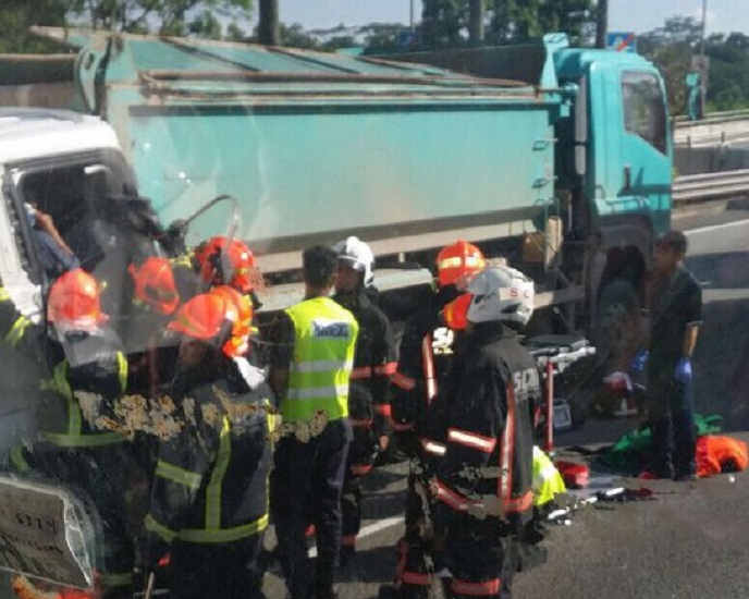 A picture shown to ST shows Singapore Civil Defence Force (SCDF) officers at the scene, and a vehicle that has collided into the back of a truck.