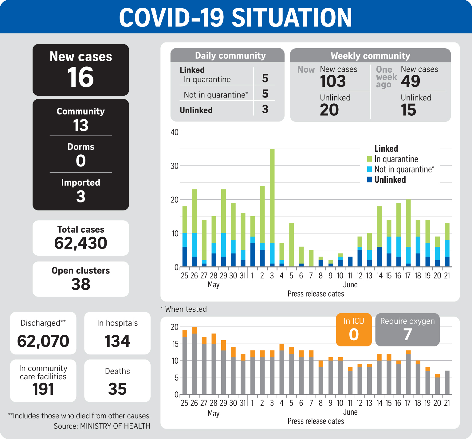 Sixteen new Covid-19 cases were confirmed yesterday, including three unlinked community cases.