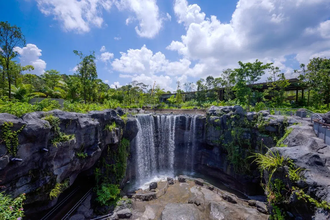 A 10m-tall waterfall in Mandai Wildlife West greets visitors as they arrive. It was sculpted after Indonesia’s Madakaripura waterfall.