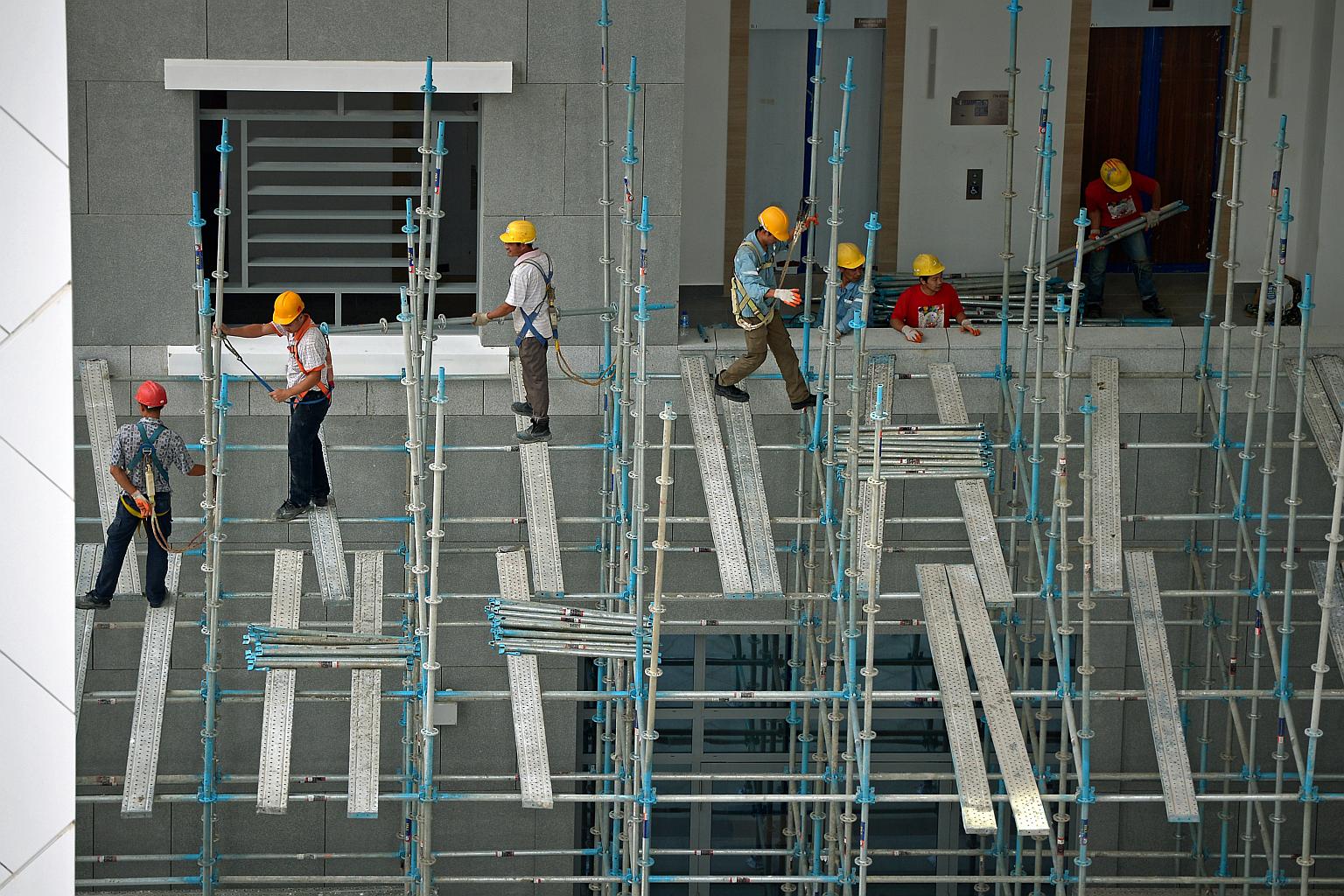 Construction workers standing precariously on a single narrow platform at a construction site along Waterloo Street on Feb 14, 2015.