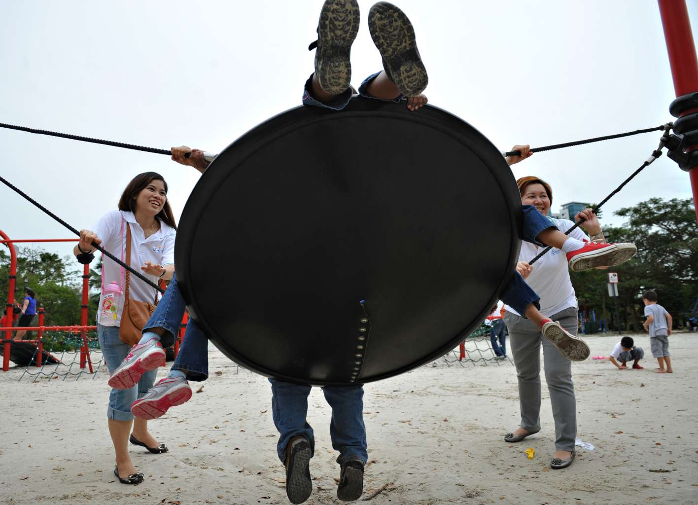 Singapore Pools staff members Jesslin Ong (left), 23, and Charmaine Chng, 40, playing at West Coast Park earlier this week with children from Sunbeam Place, a shelter for youngsters, as part of their company’s corporate social responsibility programme.