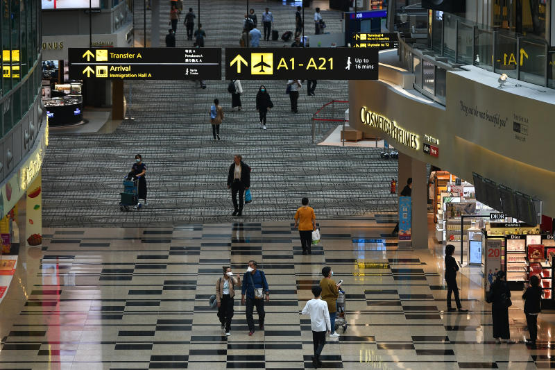 Passengers wearing face masks walk inside the transit area of Changi Airport Terminal 3 on Feb 12, 2020.