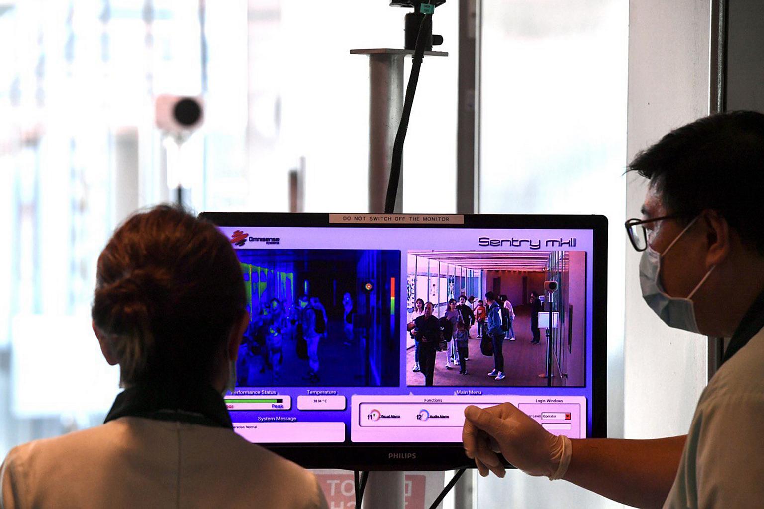 Staff at Changi Airport Terminal 3 manning a thermal scanner as passengers pass through, on Jan 22, 2020.