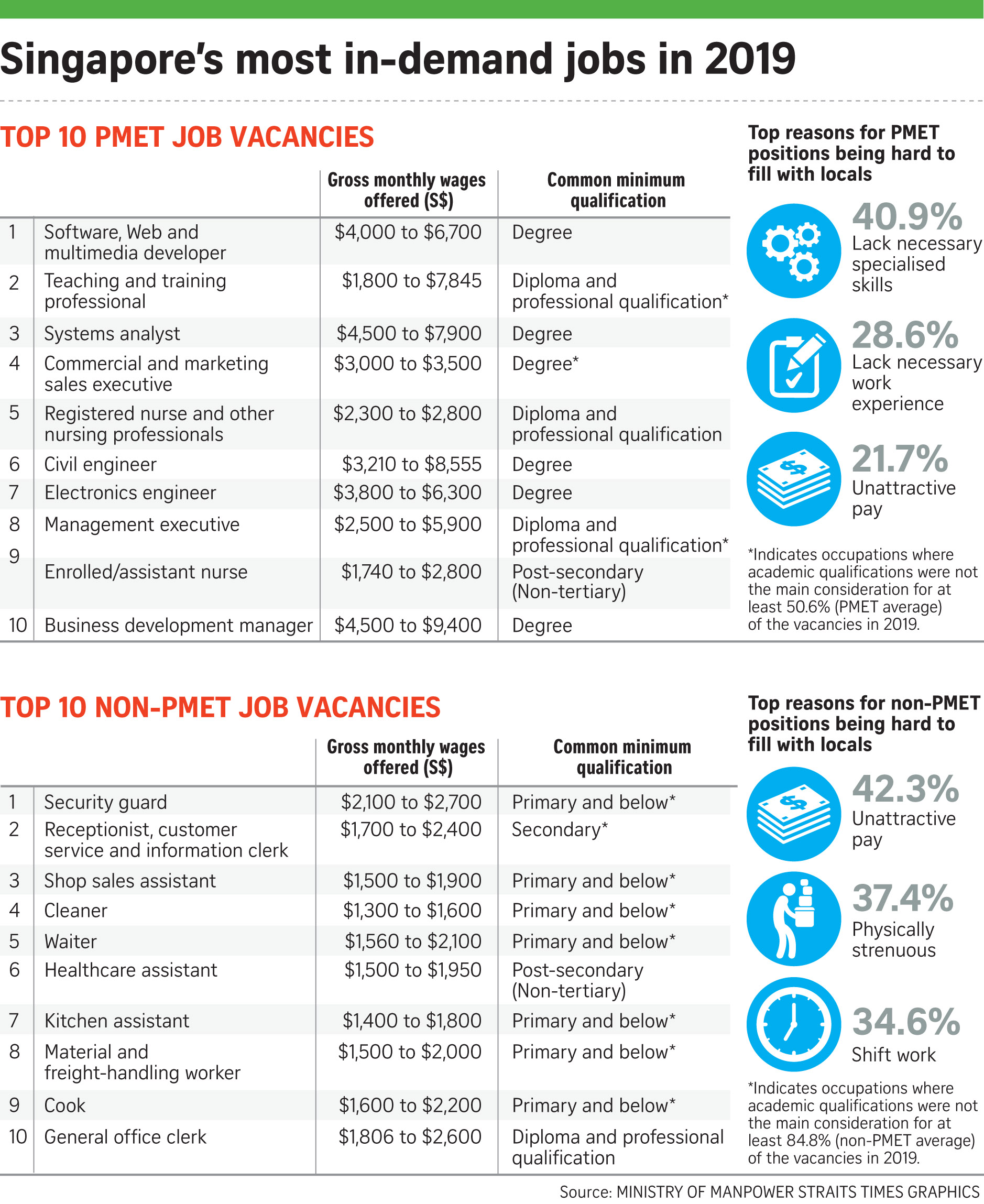 Skilled workers were increasingly in demand, with the share of vacancies for PMETs rising to 58 per cent last year, up from 53 per cent the previous year.