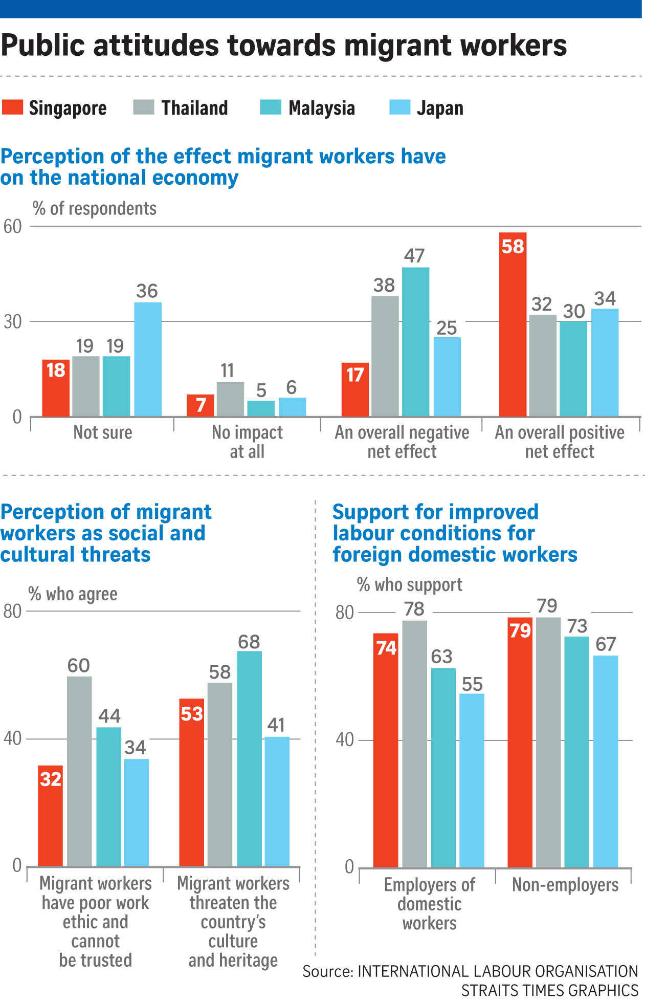 About 30 per cent here view migrant workers as a "drain on the national economy", lower than the 47 per cent in Malaysia, 40 per cent in Thailand and 32 per cent in Japan who agree with the statement.