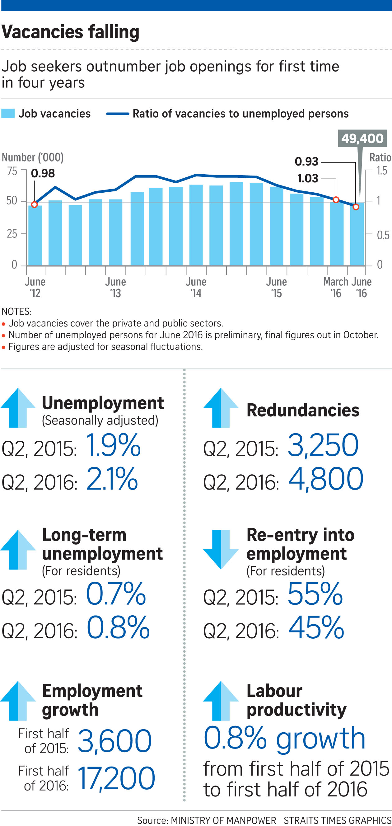 For the first time in four years, there were also fewer vacancies than job seekers, according to the Ministry of Manpower's figures released yesterday.