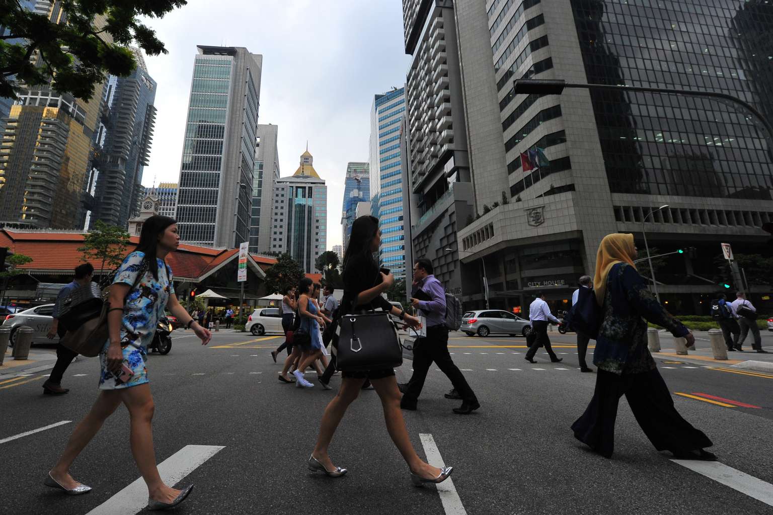 Office workers crossing the road at Robinson Road in the Central Business District.