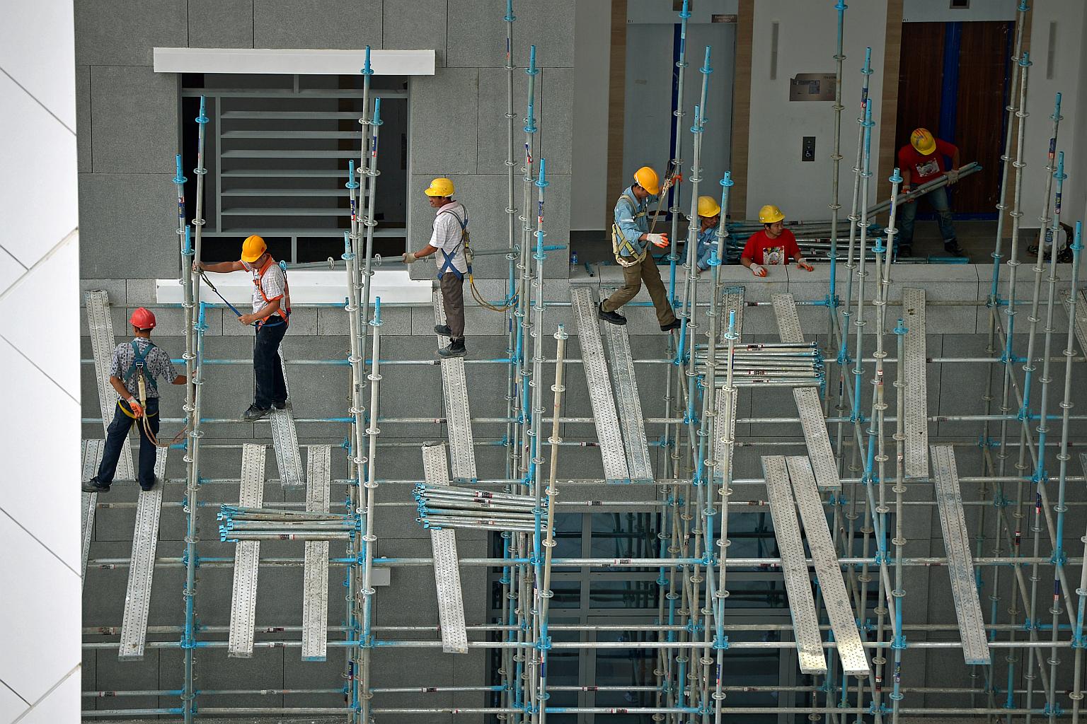 Construction workers standing precariously on a single narrow platform at a construction site along Waterloo Street on Feb 14, 2015.