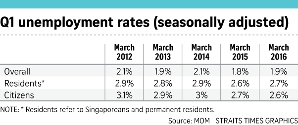 SINGAPORE - Unemployment for Singapore citizens and residents fell in the first quarter of this year, according to the Manpower Ministry's labour report released on Monday (June 13).