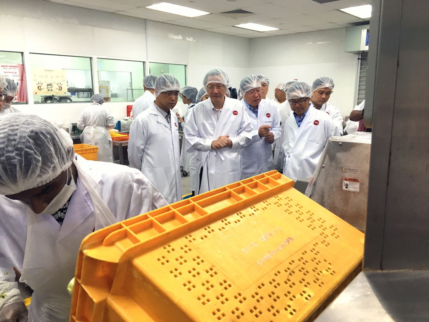 (From left) SATS Inflight Catering Senior vice-president Goh Siang Han, Minister of State for Manpower Sam Tan, SATS Chairman of Food Solutions Tan Chuan Lye and Singapore National Employers Federation vice-president John Ng on a tour of the SATS Inflight Catering Centre 1 on Jan 17, 2017.