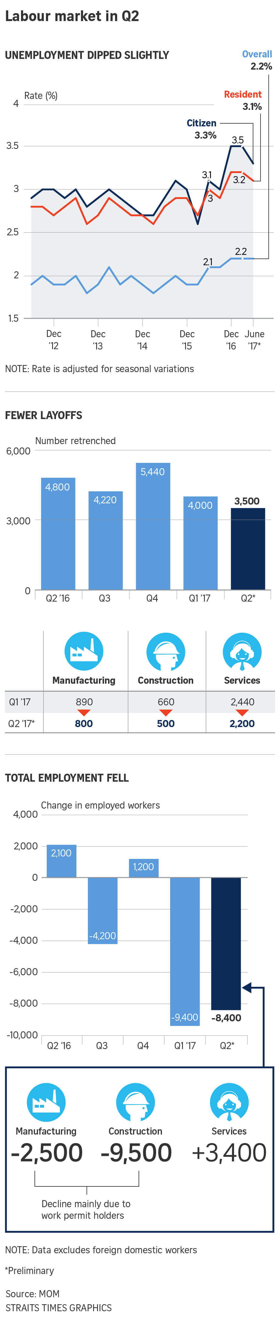 Unemployment and layoffs down in Q2 2017; total employment continues to fall: MOM