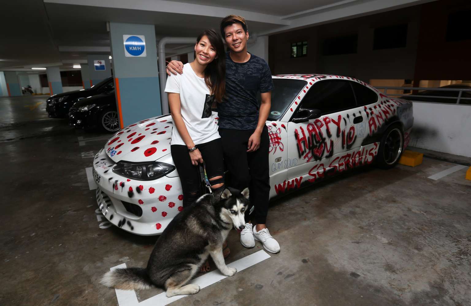 Mr Sim Yumin, 36, and his girlfriend Shereen Tan, 29, pose with Mr Sim's heavily-vandalised Nissan Silvia S15.