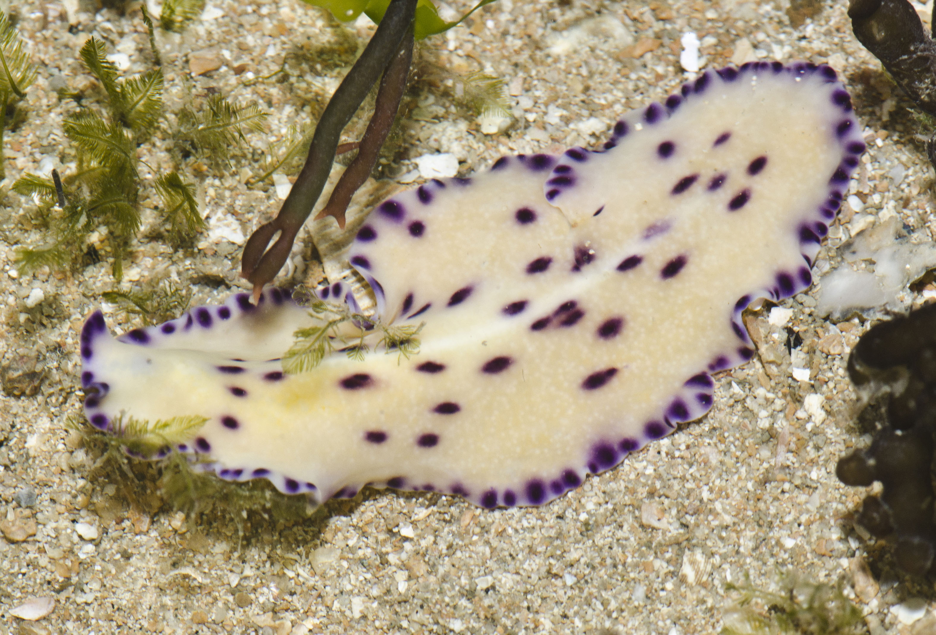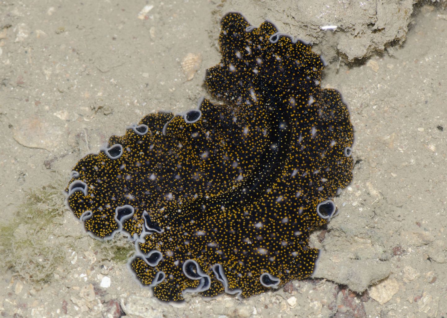 BODY: Can be as large as a hand, and is densely spotted with yellow-tipped bumps. It is one of the biggest and most commonly found marine flatworms here. The variety seen in Singapore could be potentially new to science.