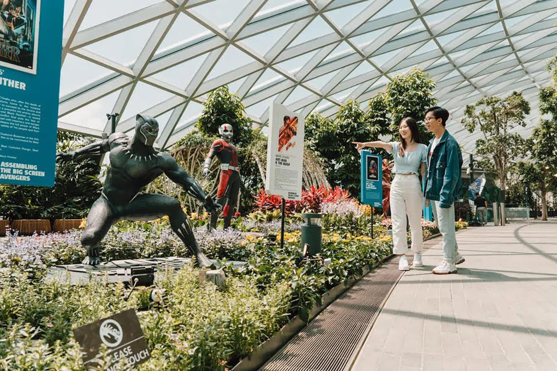 Life-size statues of superheroes from the Marvel Cinematic Universe at the Petal Garden within Canopy Park.