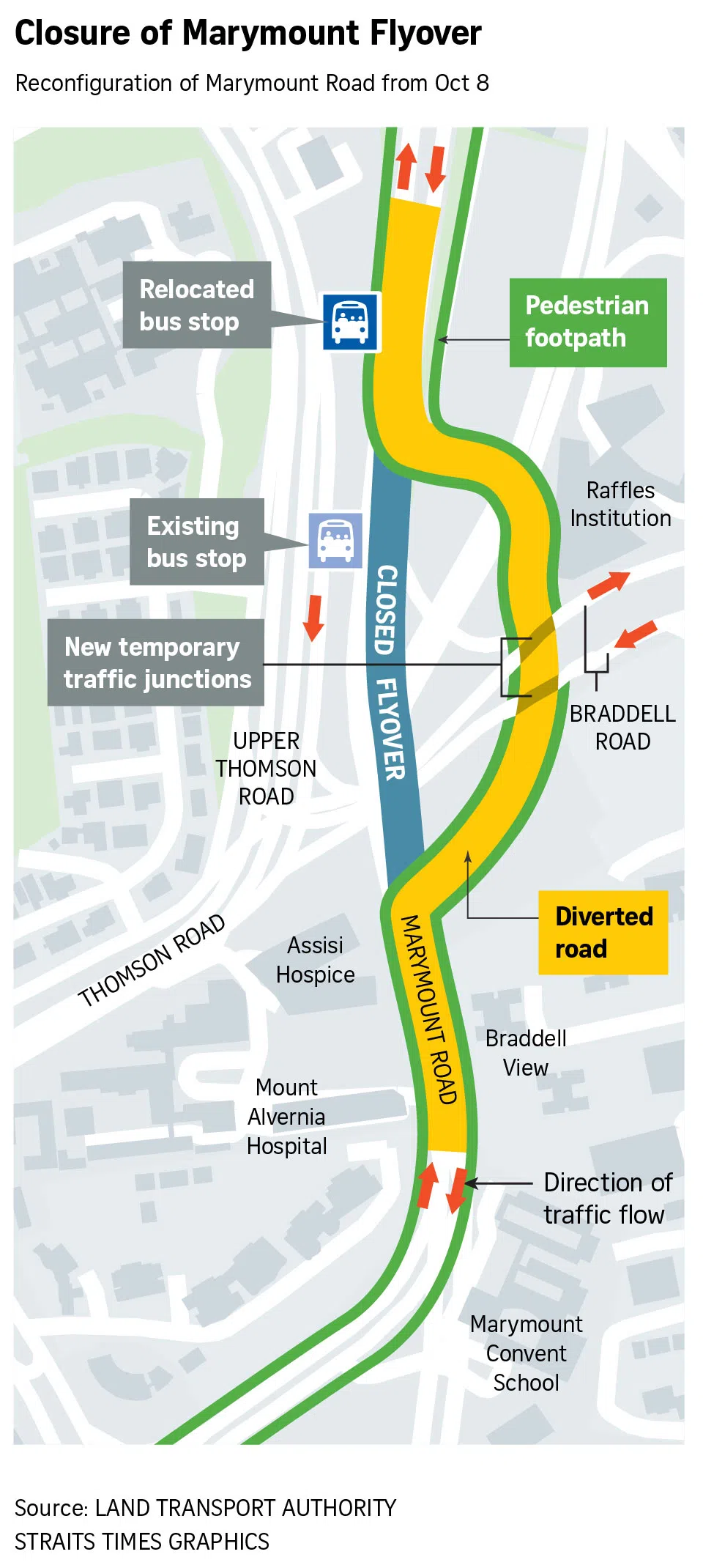 SINGAPORE - The Marymount Flyover in Upper Thomson will be closed from Oct 8 to allow construction to be done on the North-South Corridor (NSC) road tunnel, part of which will run underneath the flyover.