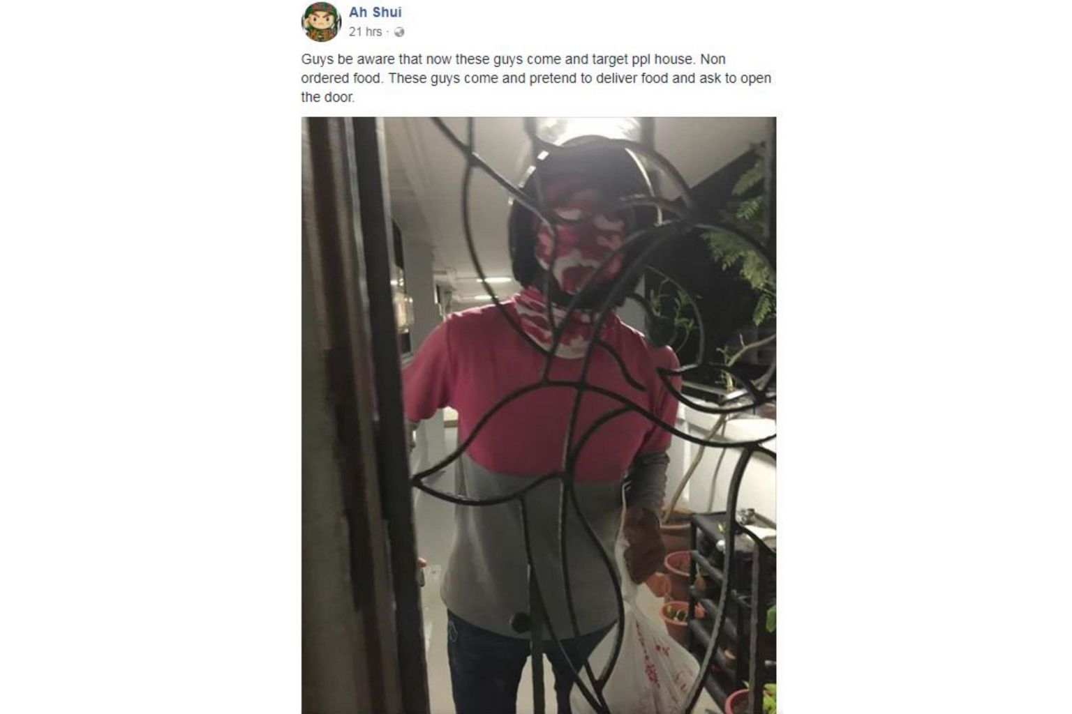 Facebook user Ah Shui posted the photo on Monday, with the caption: "Be aware that now these guys come and target ppl house (sic). (None) ordered food. These guys come and pretend to deliver food and ask to open the door."
