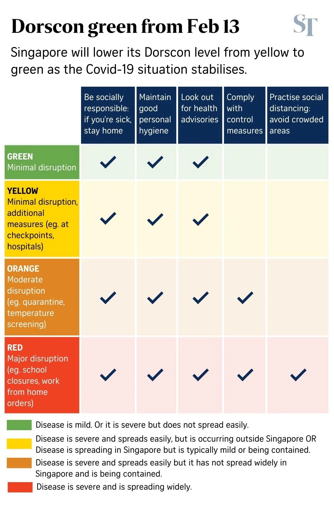 The Republic raised its Dorscon level from green to yellow on Jan 21, 2020, and to orange on Feb 7 that same year. lowered from orange to yellow