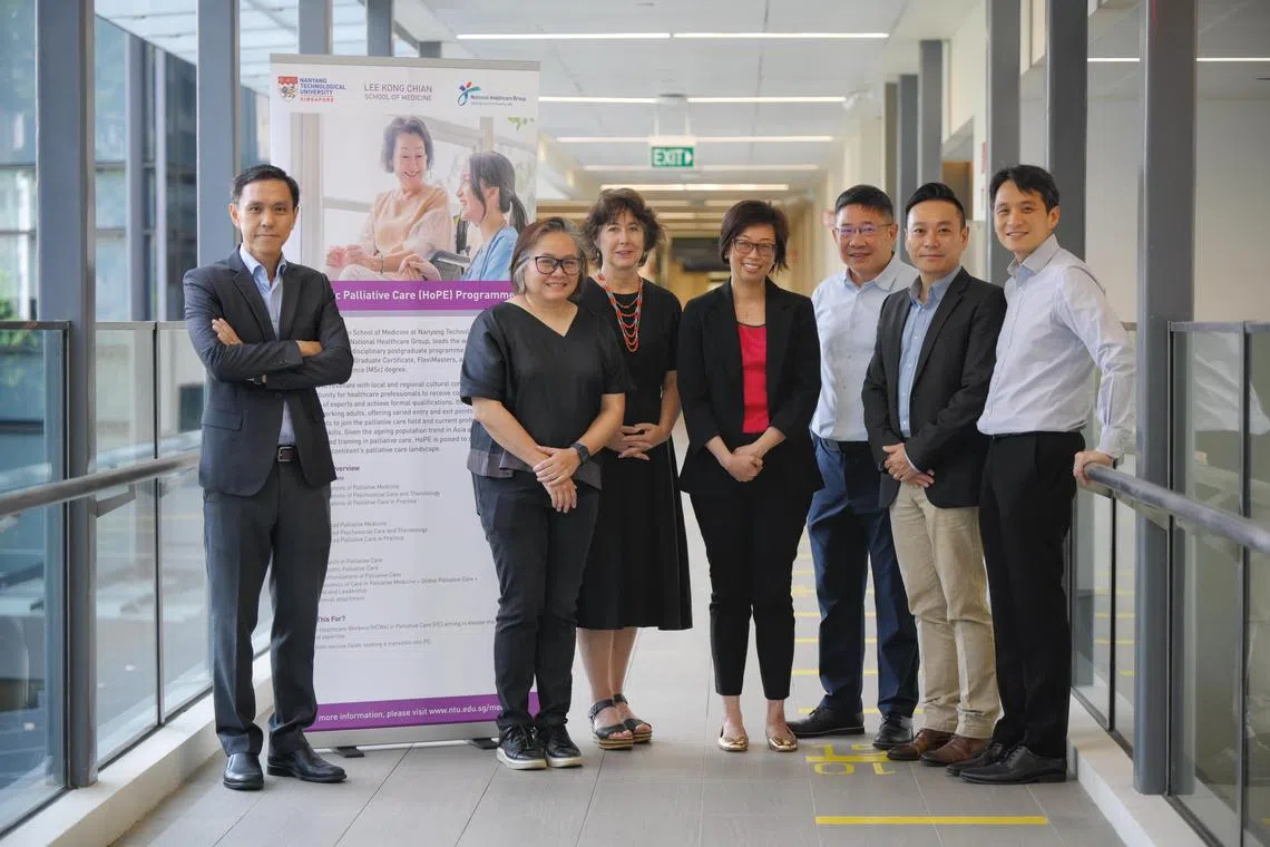 (From left) NTU LKCMedicine’s HoPE programme director Emmanuel Tan, National Healthcare Group’s Associate Professor Michelle Jong, NTU LKCMedicine’s education vice-dean Jennifer Cleland, PalC centre director Allyn Hum, NTU Centre for Professional and Continuing Education’s Dr Fabian Lim, and NTU LKCMedicine’s Associate Professor Andy Ho and Dover Park Hospice’s medical director Mervyn Koh.