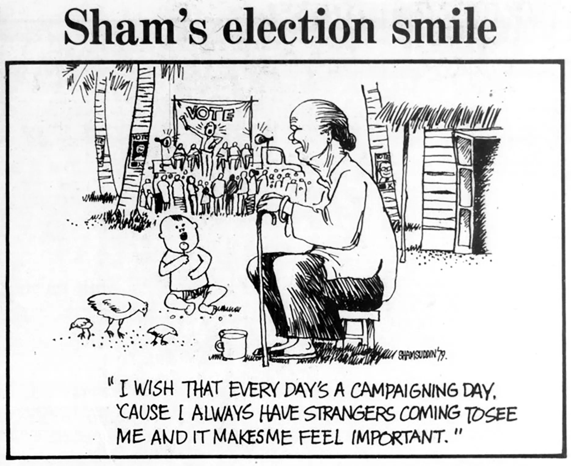 An example was a series of cartoons on the lighter side of the 1979 by-elections by freelance graphic artist Shamsuddin H. Akib titled “Sham’s election smile”, that he contributed to The Straits Times. In one strip, an old woman tells a child how she wishes every day were campaigning day so that strangers would come and see her and make her feel important.