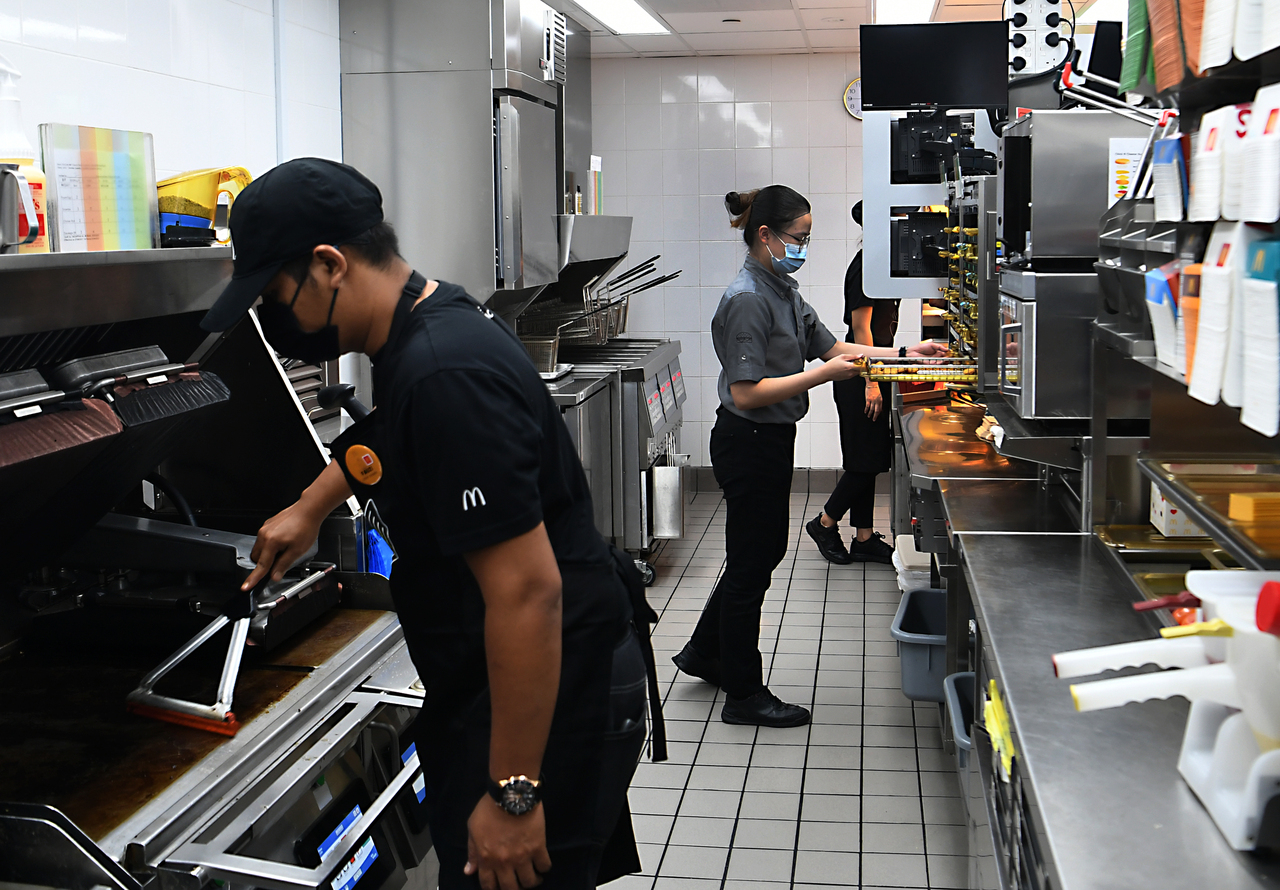 Kitchen staff at the McDonald's outlet in Canberra Plaza stay within their own work station and do not move around.