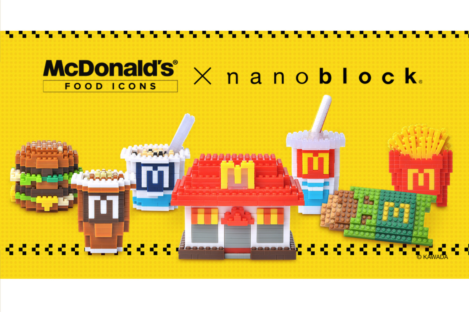 The McDonald's Food Icons x nanoblock series comprises toy versions of french fries, a cold cup, an apple pie, a McFlurry, a Big Mac and a McCafe cup.