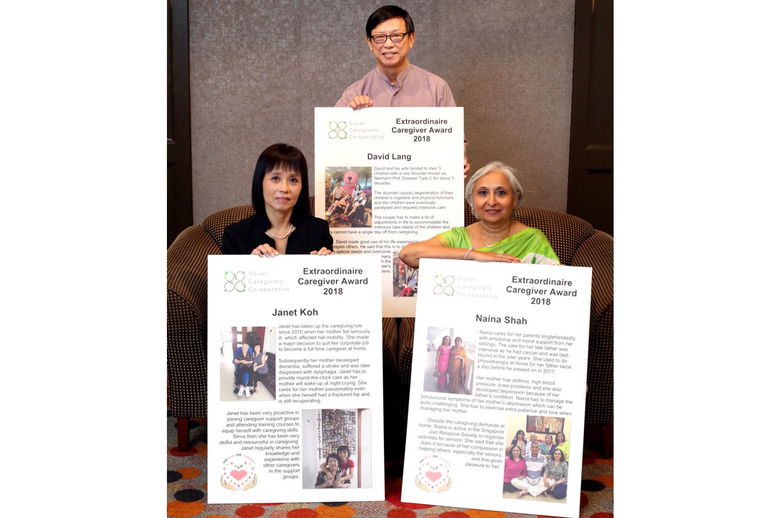 Mr David Lang, Ms Janet Koh and Ms Naina Shah were recognised with the Extraordinaire Caregiver Award given by Silver Caregivers Co-operative Limited at their Caregivers Celebration Dinner on March 15, 2018.