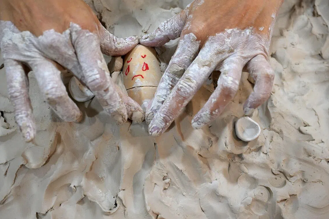 Ms Yoko Choi demonstrates how patients may reveal their mental state and emotions through the use of clay and figurines in an art therapy session.