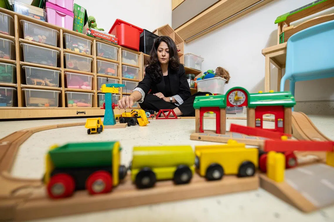 Dr Vinita Sajan Tahilramani demonstrating how her young clients would assemble the train track. She aims to always ensure they feel safe in the therapy room.
