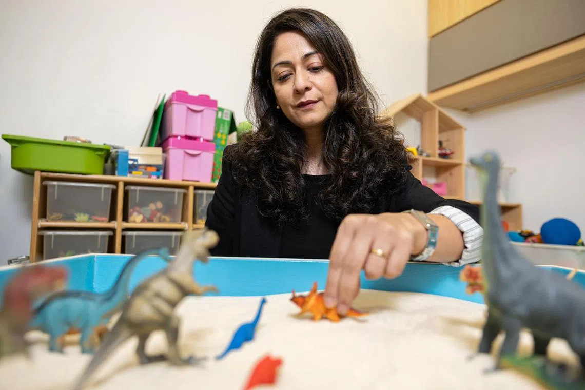 Dr Tahilramani’s therapy room is filled with toys like building blocks, doll houses, puppets and characters from popular animated series like Inside Out and Paw Patrol, as well as sand trays.