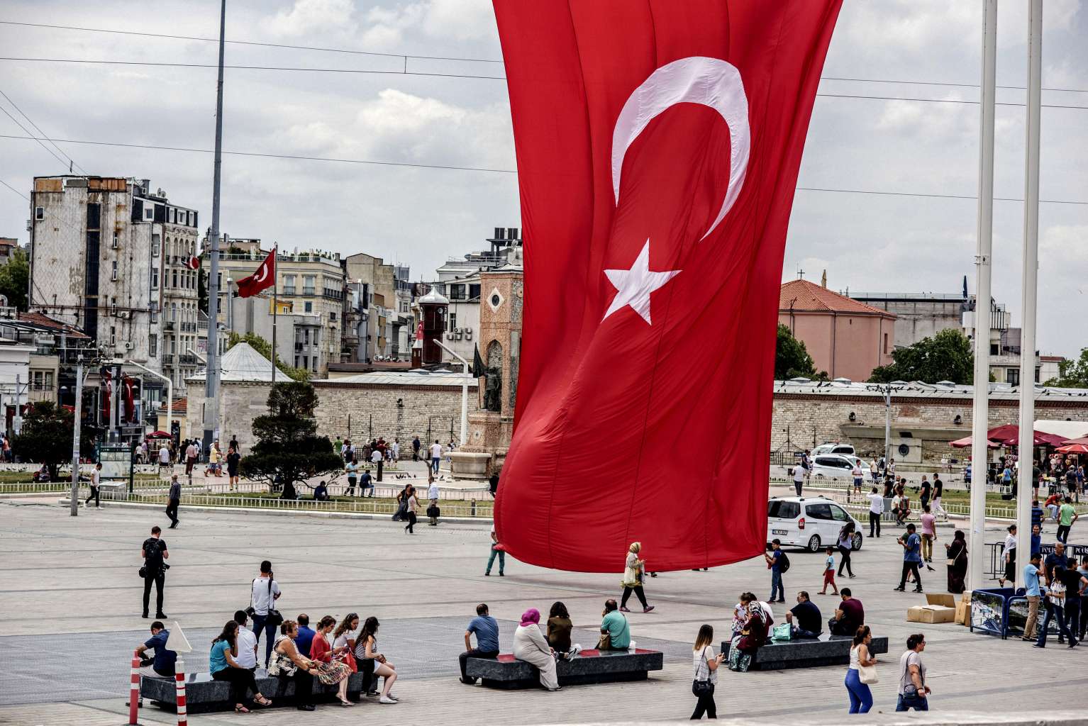 Locals and visitors sit beneath a giant Turkish national flag on Taksim Square in Istanbul, Turkey.