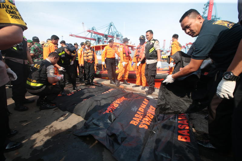 Indonesian rescue team members evacuate the bodies of the victims of the crashed Lion Air flight JT610 at Tanjung Priok Harbour, Indonesia, on Oct 29, 2018.