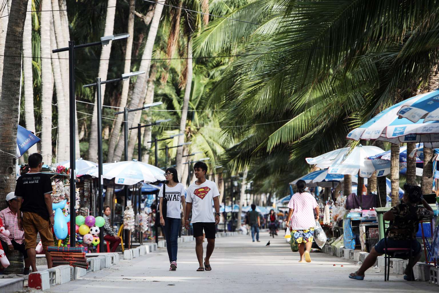 Tourists walk past market stalls next to a beach near Pattaya in Thailand.