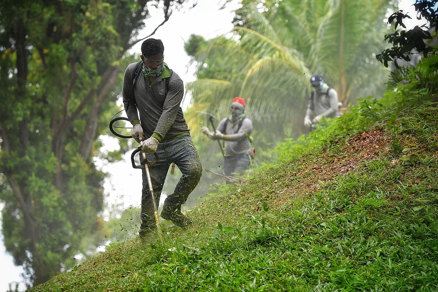 Migrant workers who moved into apartments in Kismis Avenue two months ago helping to trim some 1.5 ha of grass around neighbouring Toh Yi Drive yesterday. They volunteered for the grass-cutting initiative as a gesture of appreciation for the Bukit Timah residents who had warmly welcomed the workers with care packs and gifts when they relocated in May.