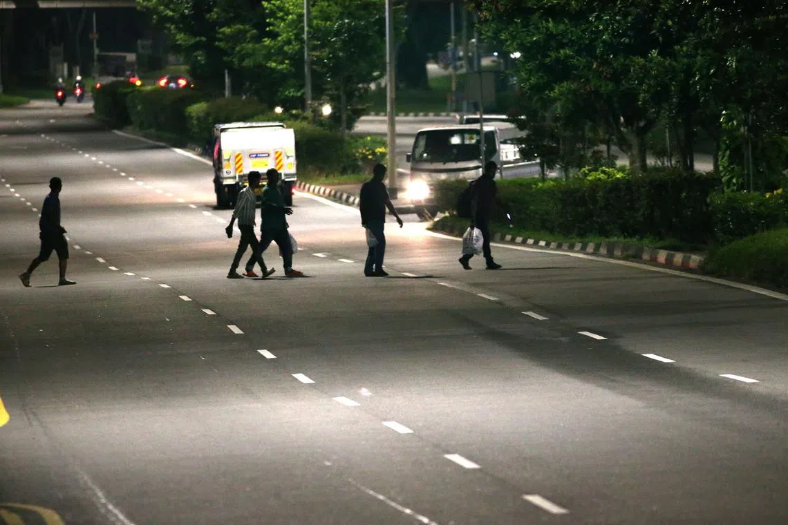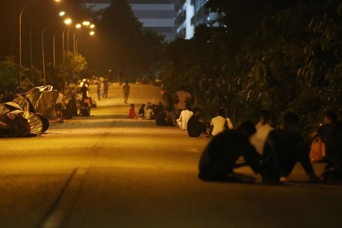 SINGAPORE - Motorists driving near workers’ dormitories have flagged concerns over migrant workers eating and drinking alcohol at night by the roads near their residences, saying the men are at risk if an errant driver mounts a kerb.