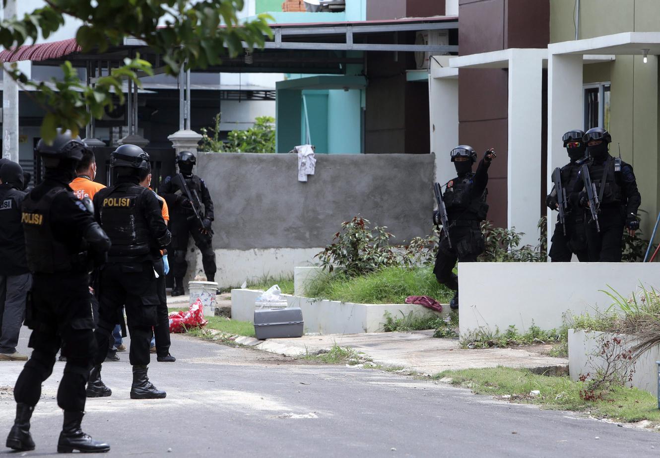 An Indonesian anti-terror police squad searches for evidence during a raid at a residential area in Batam Center, Batam, Riau Islands, Indonesia, on August 5.