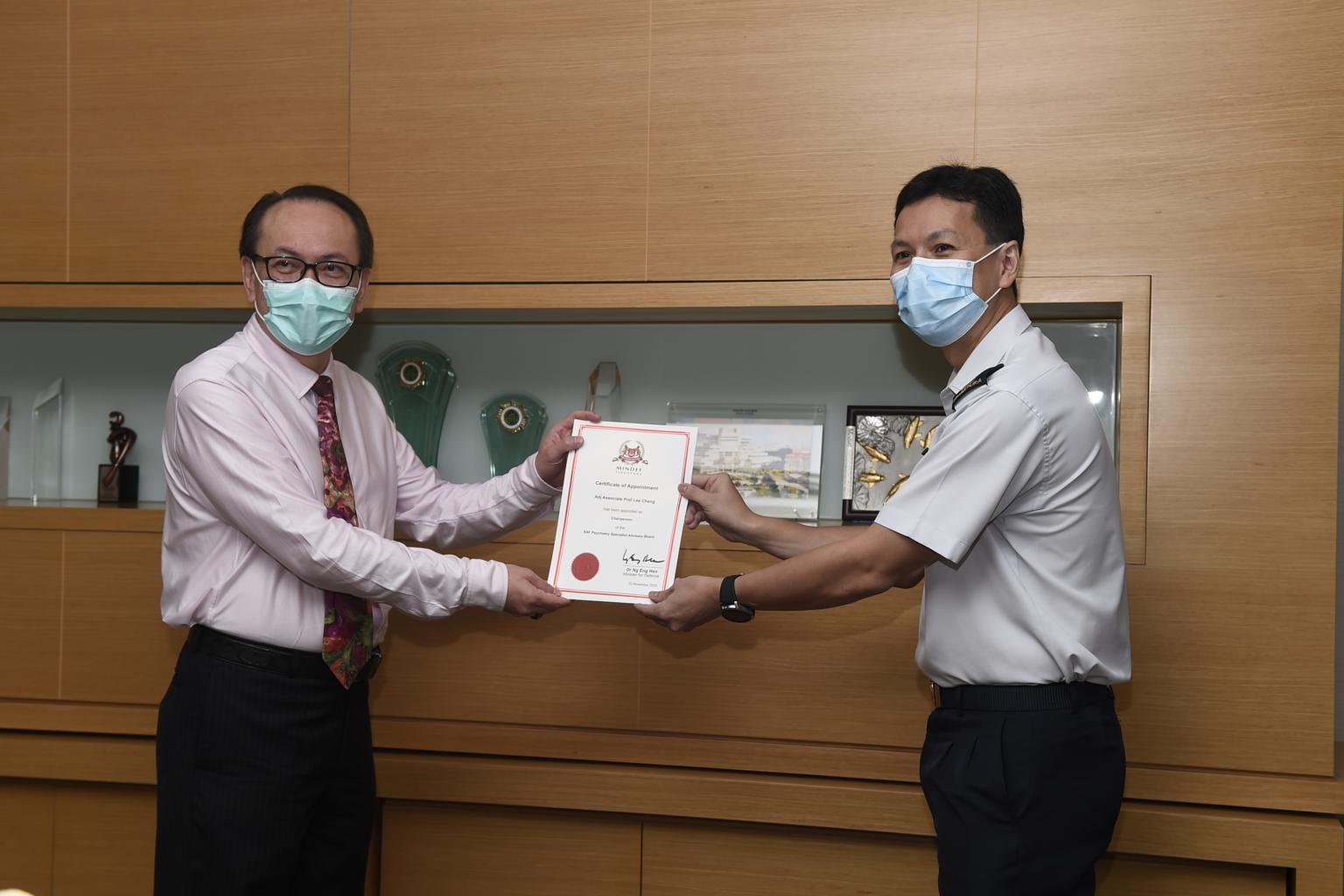 Adjunct Associate Professor Lee Cheng (left), chairman of the SAF Psychiatry Specialist Advisory Board, receiving a certificate of appointment from SLTC (Dr) Adrian Loh, head of SAF's Psychological Care Centre, on Dec 14, 2020.