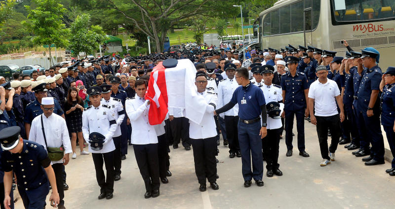 About 50 police officers sent off Staff Sergeant Nadzrie at his Choa Chu Kang home on Friday, with 11 pallbearers bearing his coffin, which was draped with the national flag.