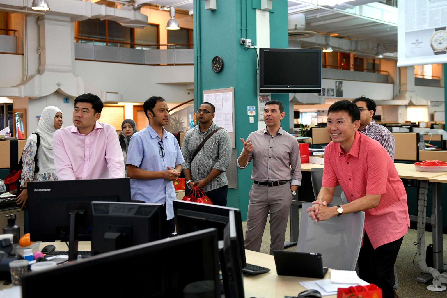 Minister of State Chee Hong Tat (extreme right) at the Straits Times newsroom on the first day of Chinese New Year on Jan 28, 2017. Also on the visit was Permanent Secretary for Communications and Information Gabriel Lim (second from left). He was briefed by editor of The Straits Times Warren Fernandez (third from right), political editor Zakir Hussain (partly hidden) and digital news editor Ernest Luis (fourth from left).
