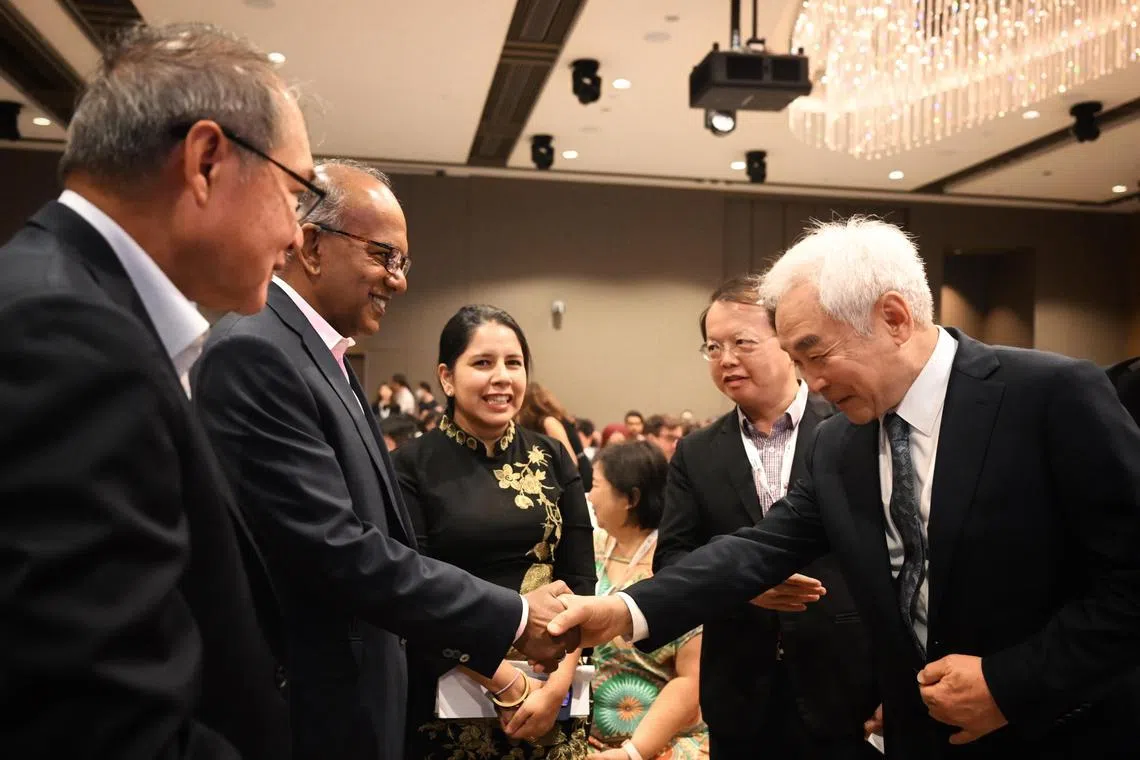 Minister for Law and Home Affairs K. Shanmugam (second from left), is flanked by Attorney-General Lucien Wong and Ms Renita Crasta, co-president of the Singapore Corporate Counsel Association, as he shakes hands with Mr Jung Kyung Taek, senior partner at law firm Kim & Chang, at the APAC Legal Congress on April 23, 2024.