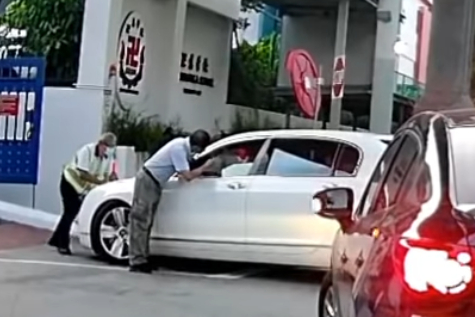 A video circulating on social media showed the driver inching his white car forward a few times, pushing the security officer back despite being stopped from entering the primary school in Bedok.