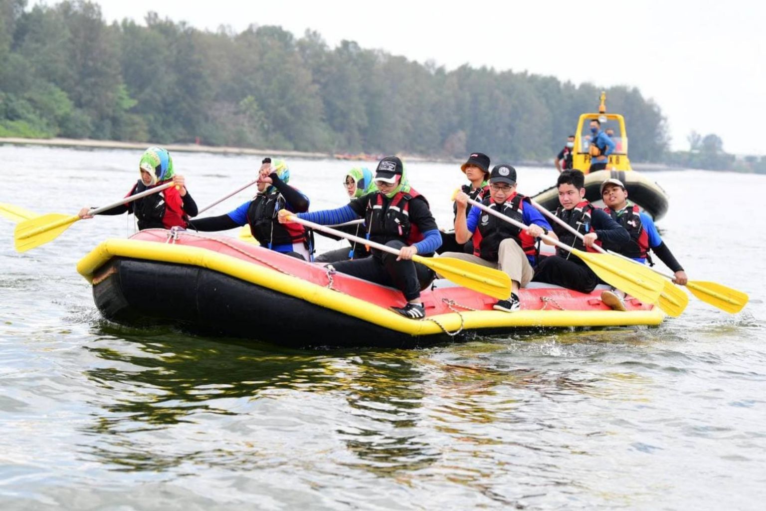 Minister for Culture, Community and Youth Edwin Tong participating in an inflatable rowboat expedition with students on March 19, 2021.