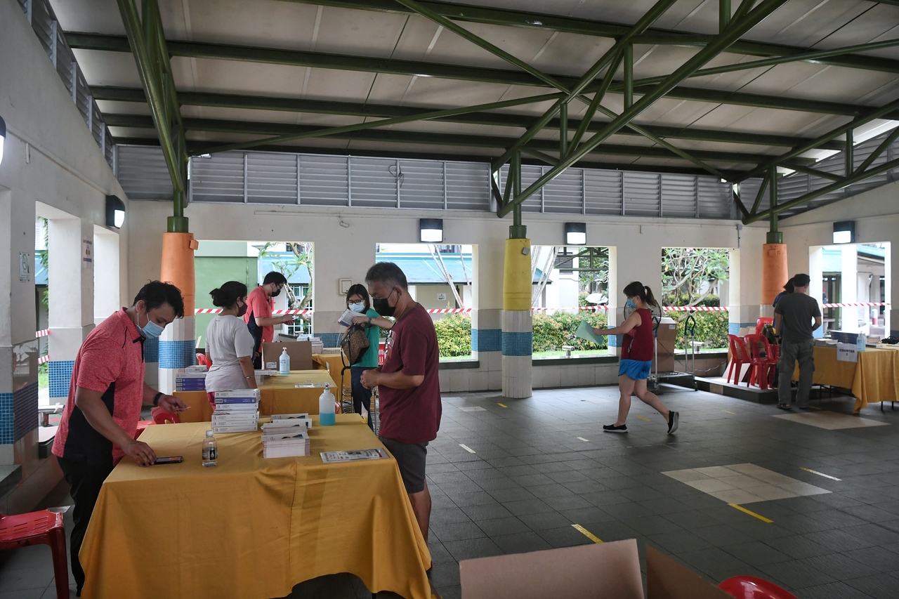Residents collecting their antigen rapid test self-test kits at the multi-purpose hall at Block 104B Henderson Crescent on June 26, 2021.