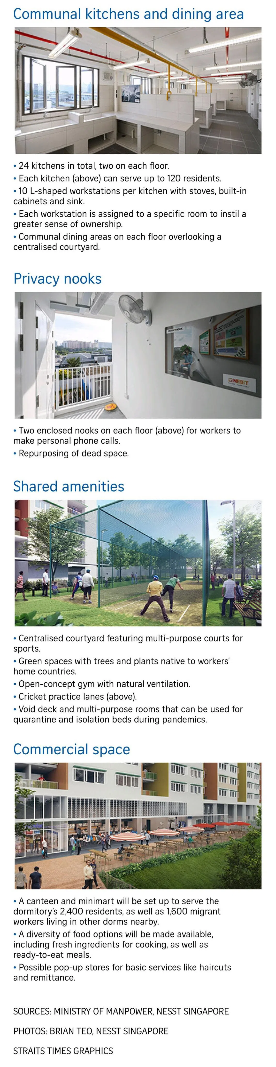 The new dormitory has also been designed with future public health threats in mind, with colour-coded access routes making it easier for workers to find their way around, and to physically segregate them should the need arise, MOM added.