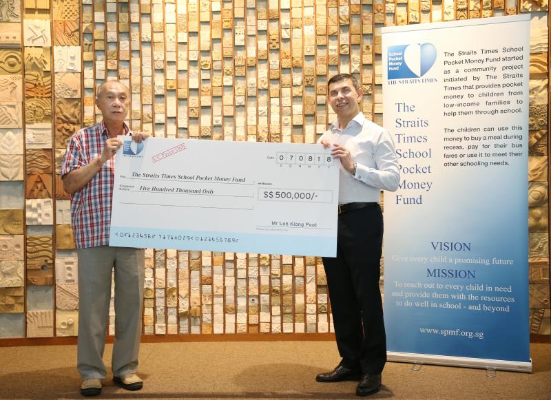 He has donated $500,000 to The Straits Times School Pocket Money Fund (STSPMF), and presented a mock cheque to STSPMF chairman Warren Fernandez at the Singapore Press Holdings (SPH) News Centre on Tuesday (Aug 7).
