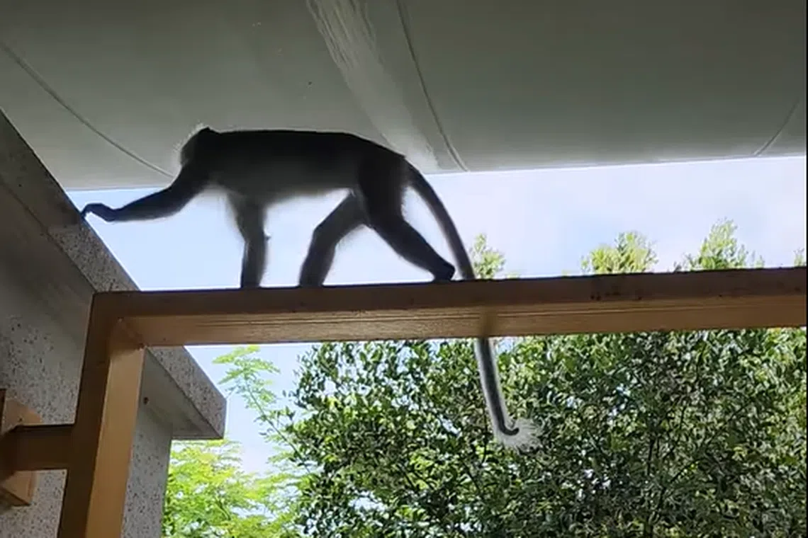 Several monkeys were seen climbing overhead bars and taking food left as offerings for the dead at Mandai Columbarium.