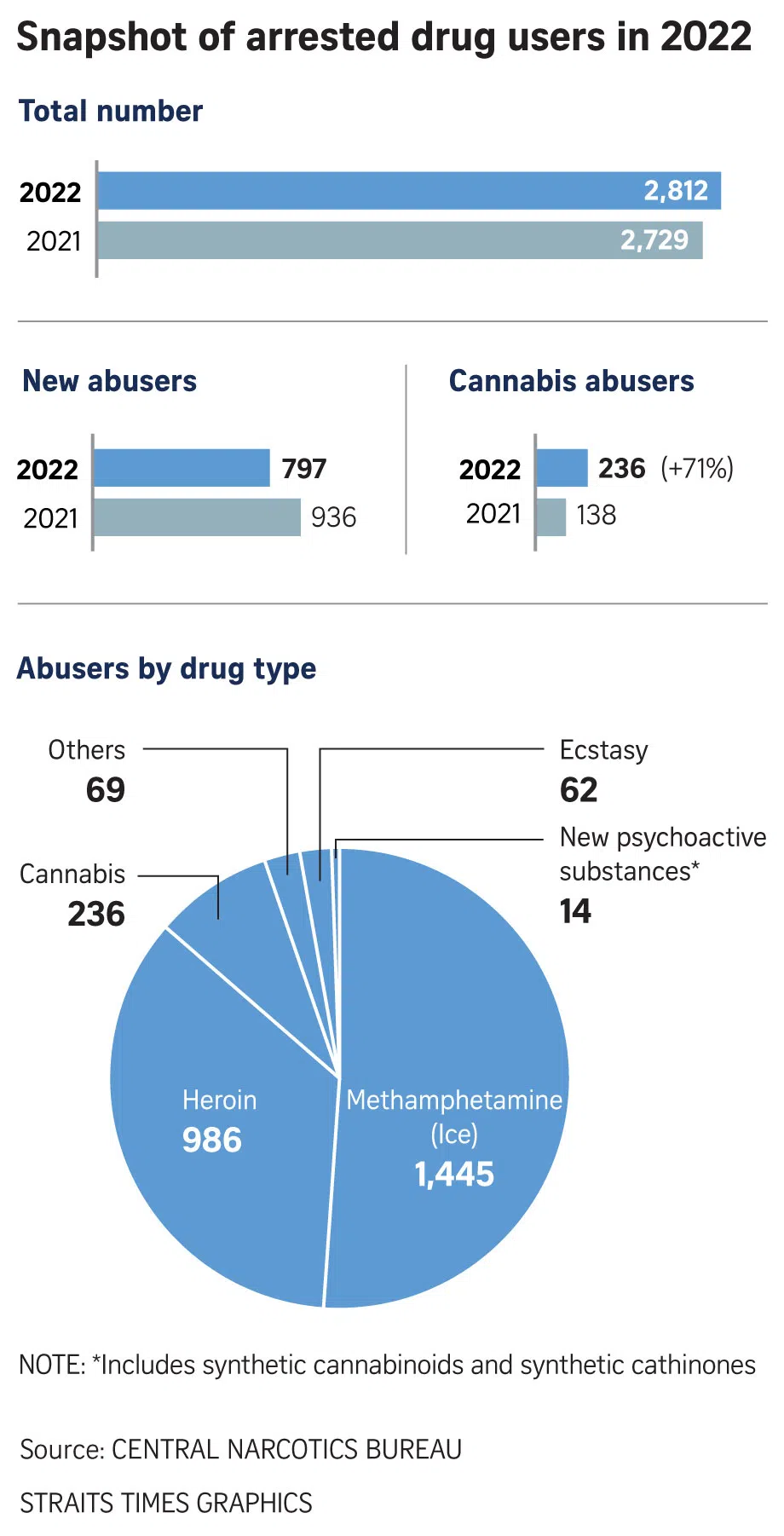 The figures released on Wednesday showed that the total number of drug abusers arrested in 2022 had increased by 3 per cent to 2,812, from the 2,729 arrested in 2021.